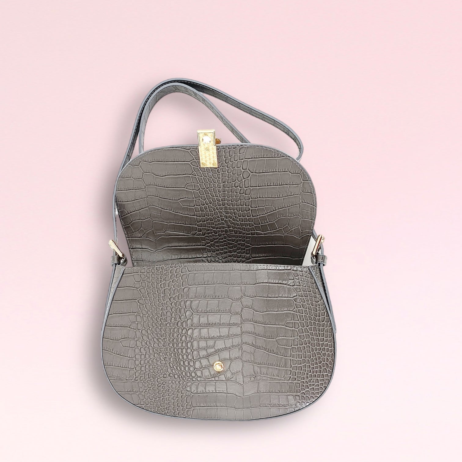Scopri la Borsa Diana, un vero e proprio must-have per ogni fashionista che cerca l'equilibrio perfetto tra stile iconico e artigianalità italiana. Realizzata in vitello stampato coccodrillo, questa borsa a postina sagomata si distingue per il suo design inconfondibile e la sua raffinatezza.