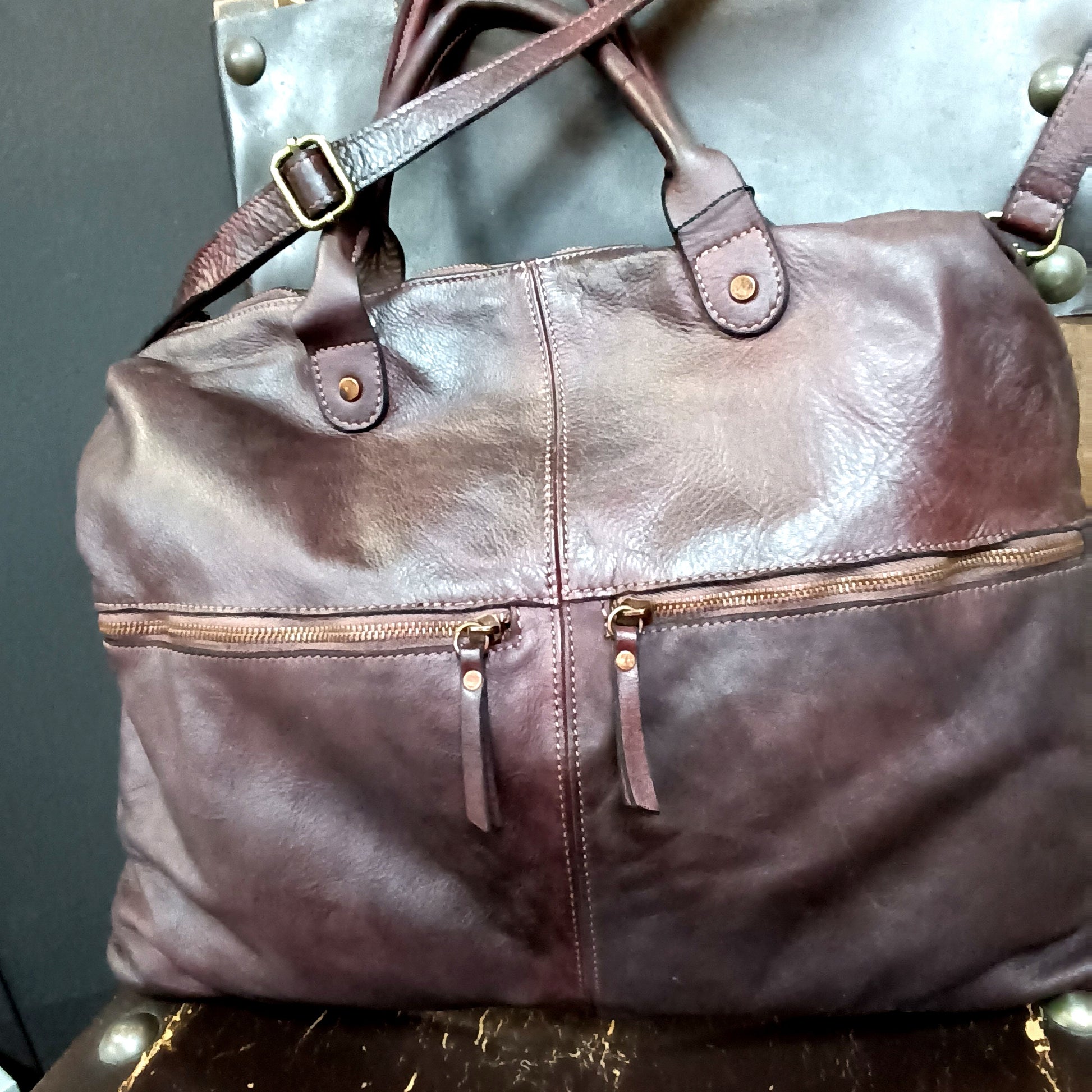 La borsa è disponibile in due varietà di colori, cuoio e prugna.